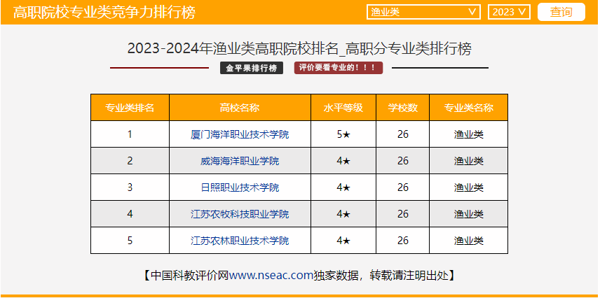 我校渔业类专业在“金平果”发布的2023年高职院校专业类竞争力排行榜中连续四年位列第一!水产养殖技术专业在高职院校专业竞争力排行榜中同样取得第一名。