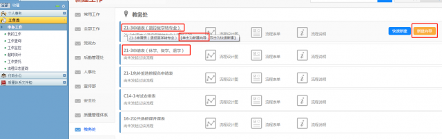 工作流——申办工作——教务处——单击“21-3申请表”——进入新建向导。(注:不要点击“快速新建”)