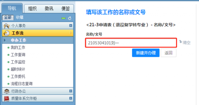 单击新建向导后进入填写工作名称,在“名称/文号”处填入异动学生的学号及姓名(如2105304101刘一),点击“新建并办理”。
